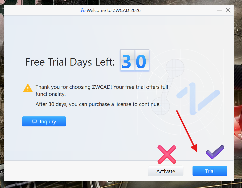 Klik tombol Trial untuk mendapatkan Free Trial selama 30 hari tanpa harus activate license.